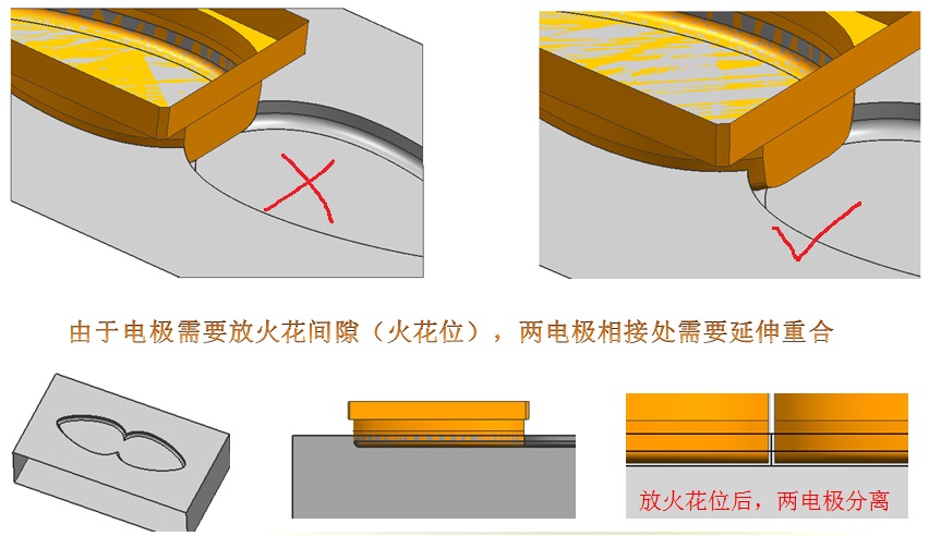 由于电极需要放火花间隙(火花位),两电极相接处需要延伸重合