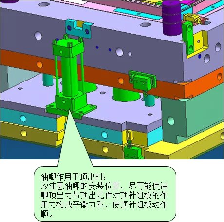 在此类应用中,应注意油唧的安装位置,尽可能使油唧顶出力与顶出元件对顶针组板的作用力构成平衡力系,减少顶针组板动哥林柱的倾覆力,使顶针组板动作顺。